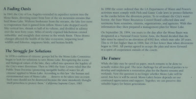 Throughout its long existence, salts and minerals have washed into the lake from Eastern Sierra streams. Freshwater evaporating from the lake each year has left the salts and minerals behind so that the lake is now about 2 1/2 times as salty as the ocean and very alkaline.