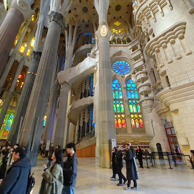| Looking back toward the doors we entered on the Nativity Facade, we see more stained-glass windows |